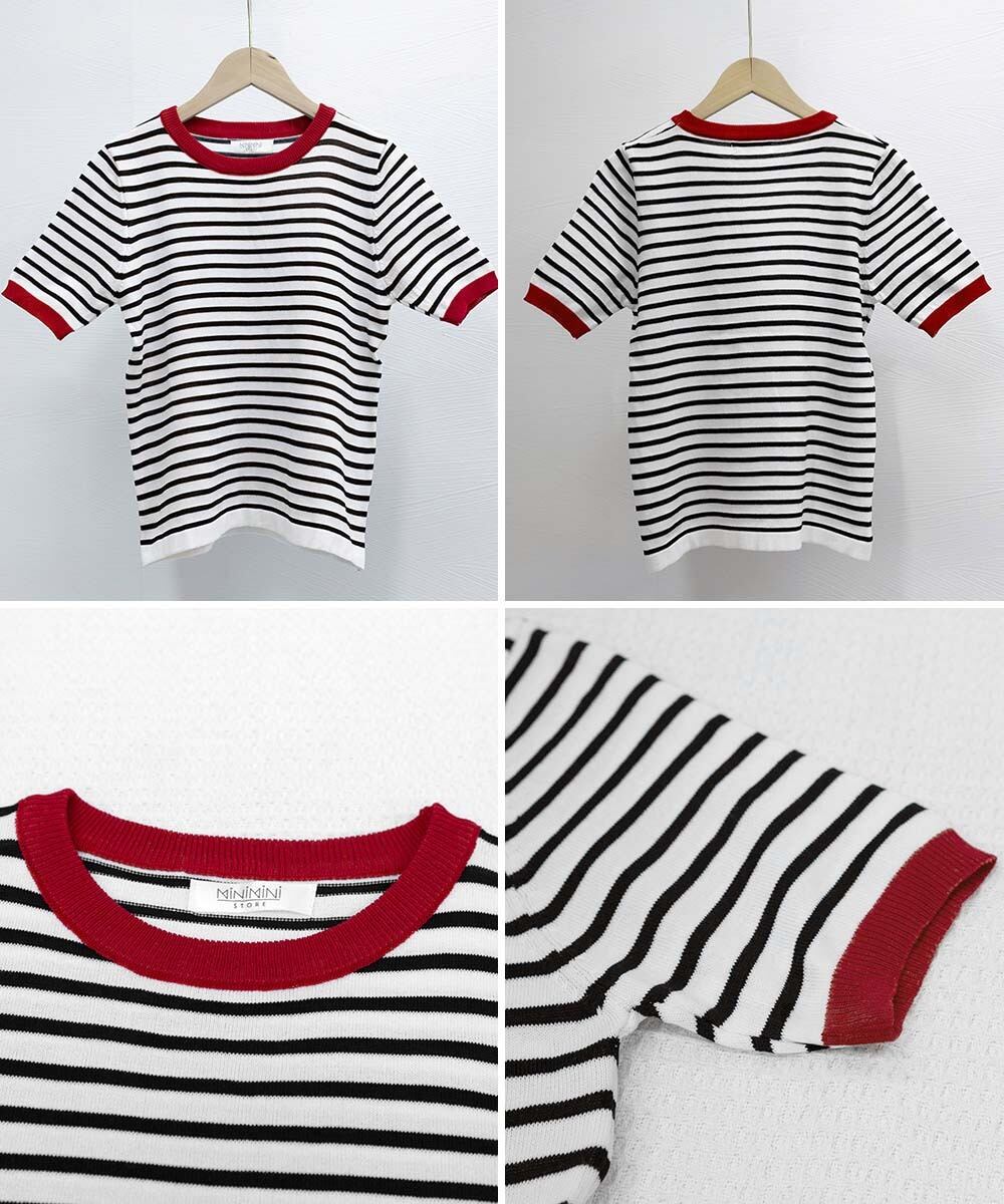 マルチボーダー×配色リブが目を惹く半袖ニットトップス。