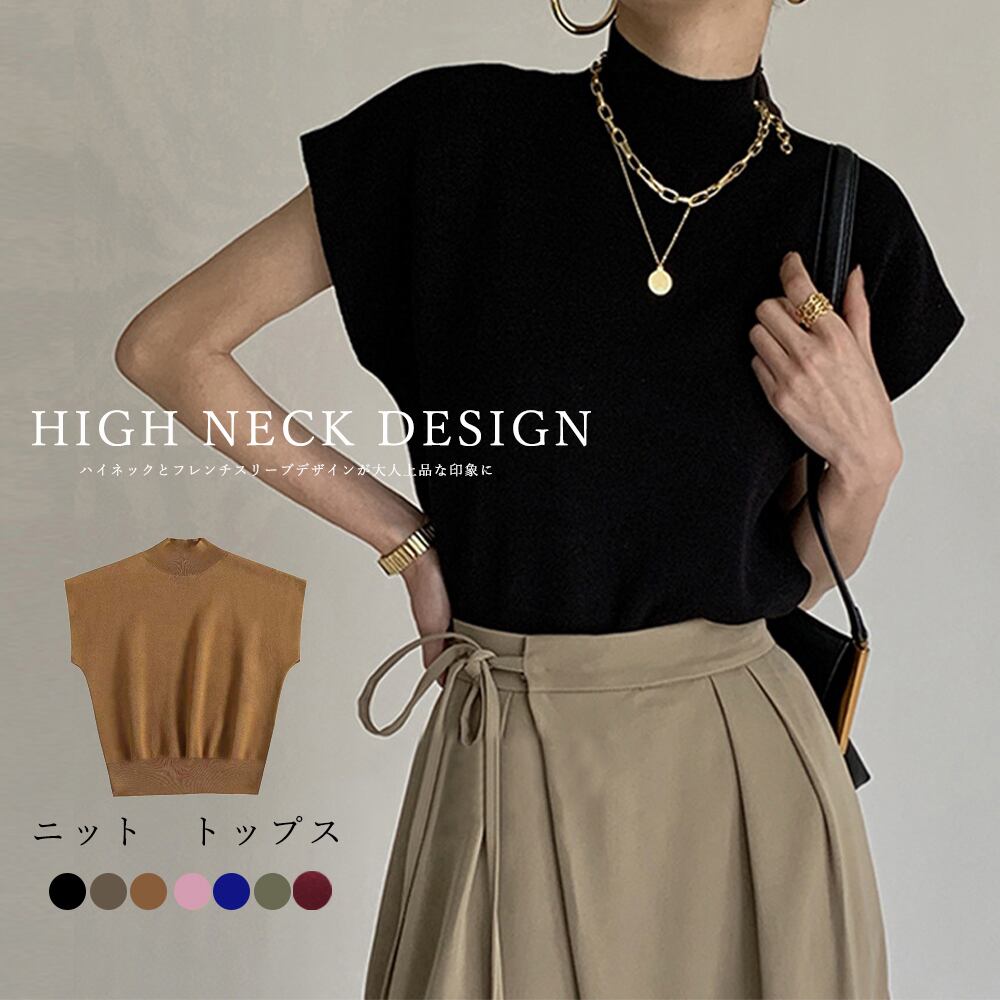 ニット トップス ハイネック ニットソー 無地 フレンチスリーブ 韓国ファッション 春秋 夏服
