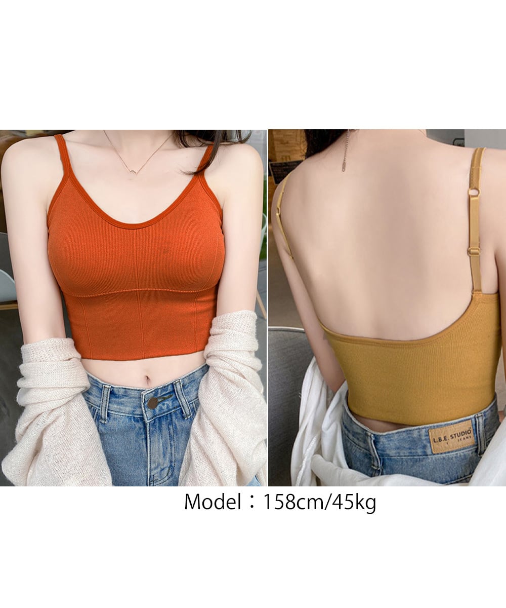 レディース 韓国風ブラトップ リブキャミ へそ出し ショート丈インナー ブラ一体型 下着 背中見せ ベアトップブラ 夏服
