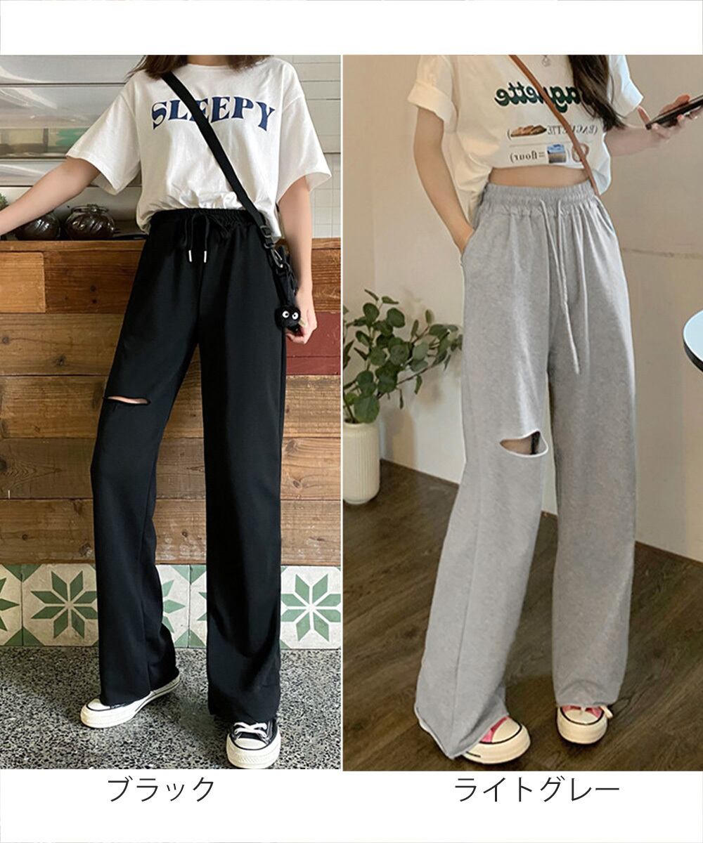韓国 穴あき スエットロングパンツ ウエストゴム イージーパンツ カジュアル リラックス ストレートパンツ 着やせ