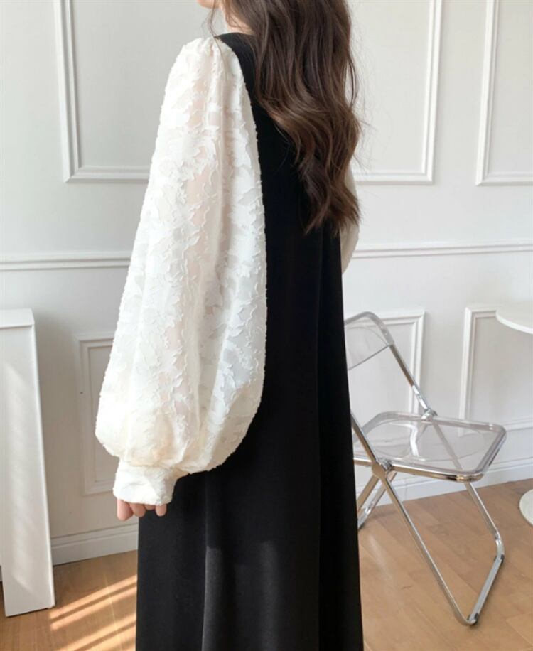 ワンピース レディース ロング丈ワンピース 長袖 異素材 Vネック レース 気質 きれいめ