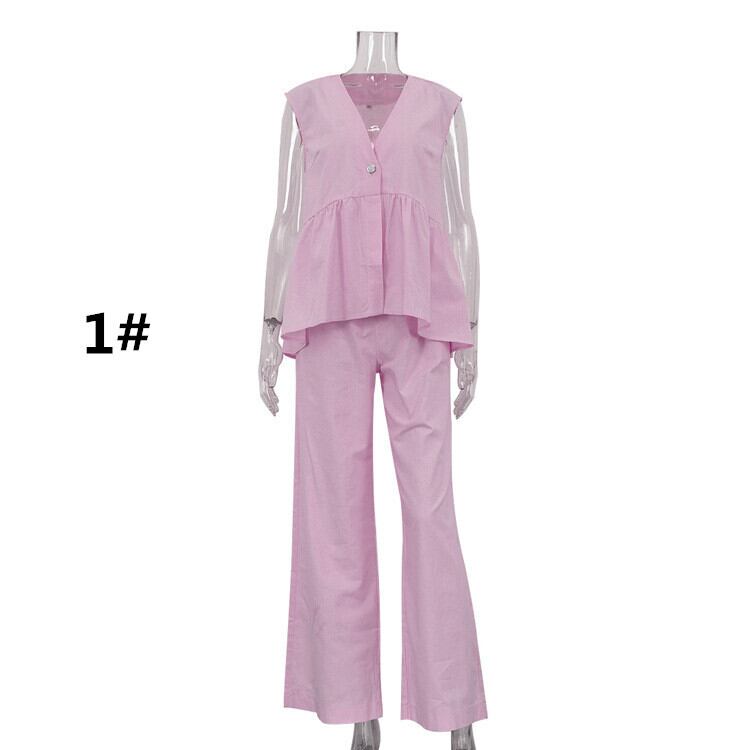 これからの季節でも涼しく快適に過ごせるセットアップが登場です!ノースリーブのVネックトップスとロングパンツの2点セットは、夏のスタイルにぴったりな一着です。