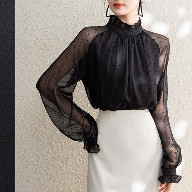 新作の長袖ブラウスが登場しました!透け感のあるシフォン素材とドット柄が、フェミニンな印象を与える一着です。軽やかな着心地と柔らかなラインが特徴で、カジュアルなお出かけや特別なイベントにもぴったりのアイテムです♪ どんなボトムスとも合わせやすく、女性らしさを引き立ててくれるブラウスです。