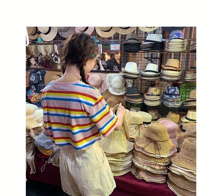 シルエット 5分袖 ゆったり カジュアル T シャツ レディース レインボー Tシャツ ボーダー柄 ゆるTシャツ シルエット 5分袖 ゆったり カジュアル