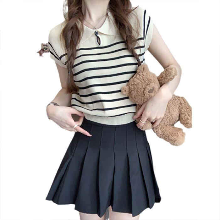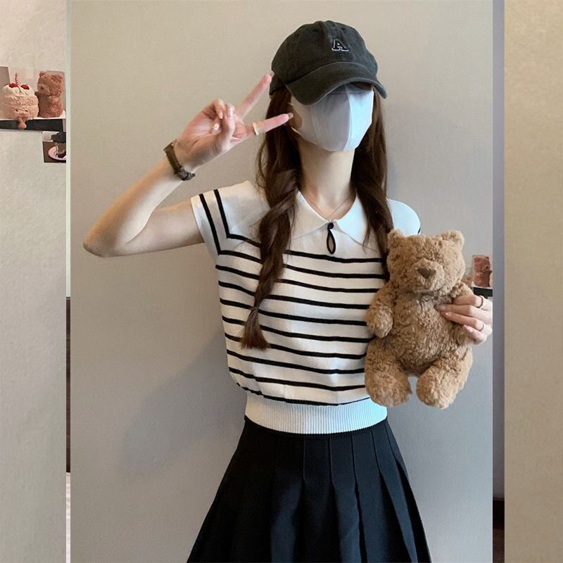 新作 ボーダー柄 ノースリーブ ニット トップス 襟付き ショート ショート丈 袖なし