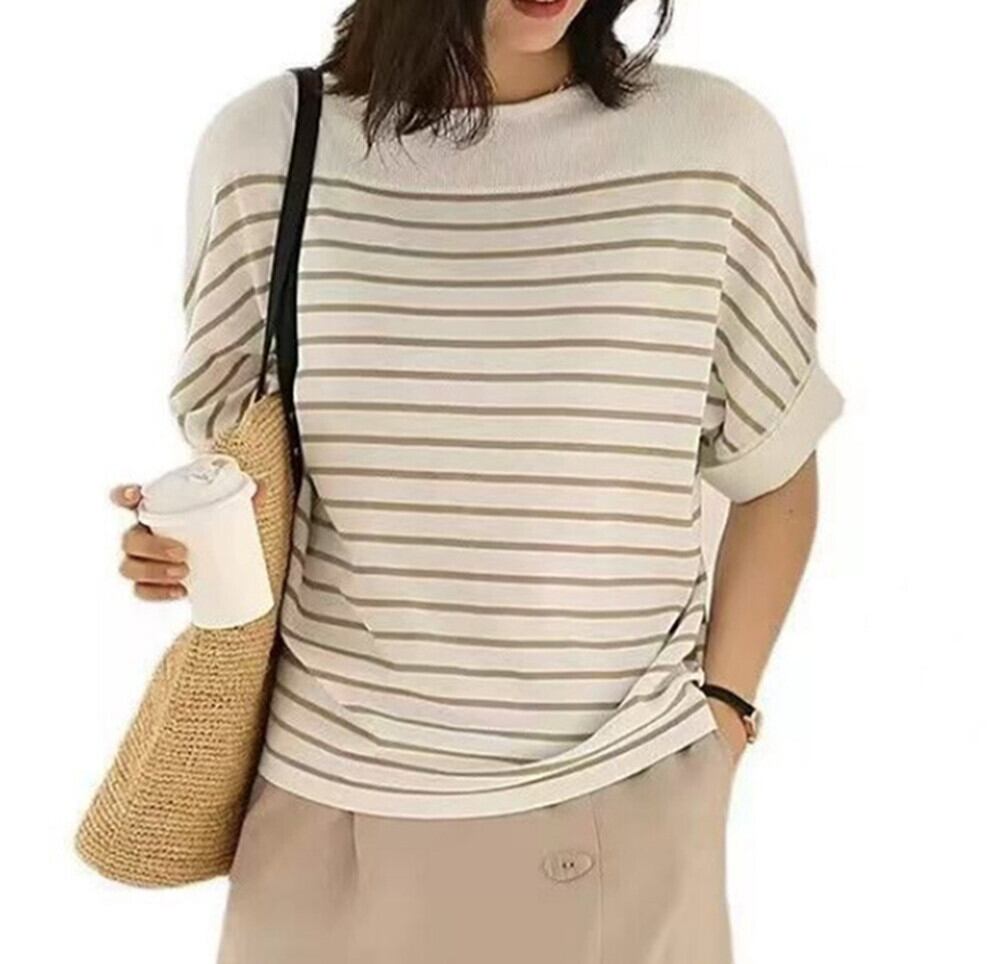 2025新作 ボーダー柄 ニットトップス Tシャツ ドルマンスリーブ カジュアル 体型カバー レディース
