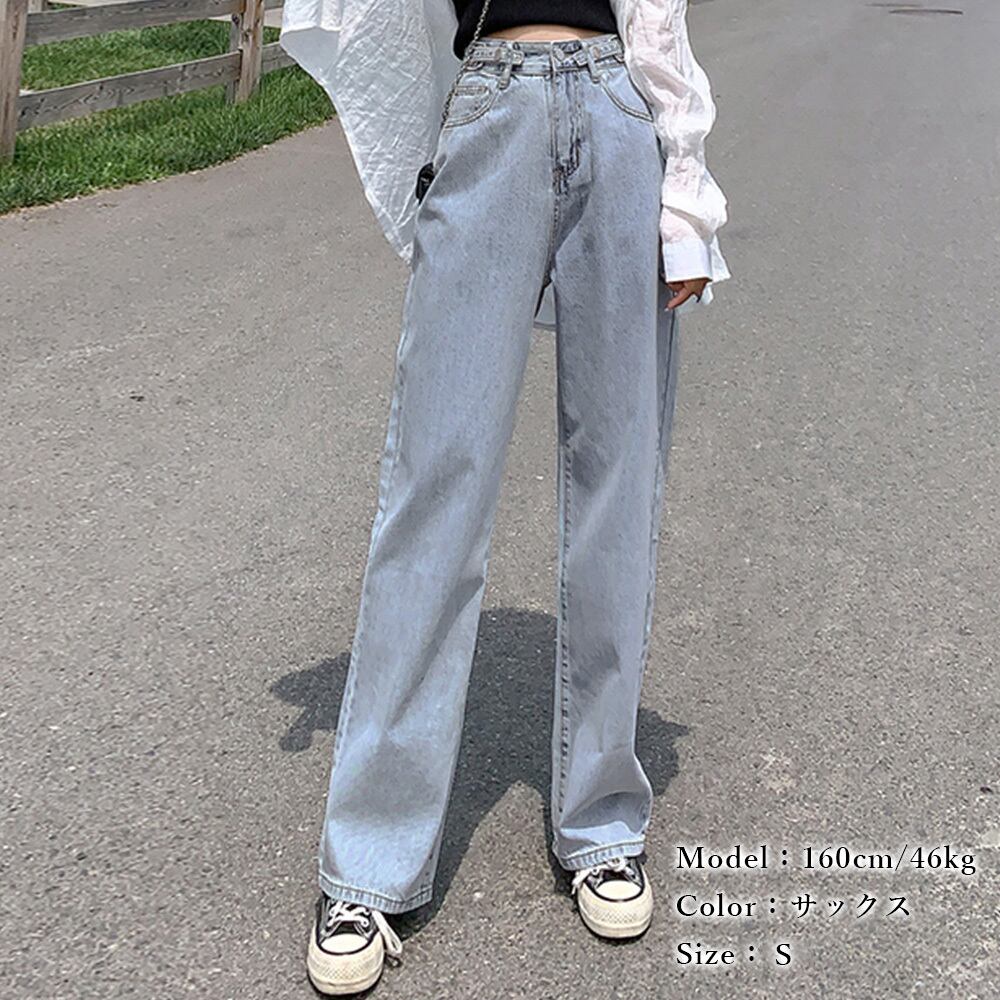 ハイウエスト セミワイドデニムパンツ 脚長見せ ロングパンツ ゆったり 着やせ ボトムス 韓国風 オルチャン定番デニム