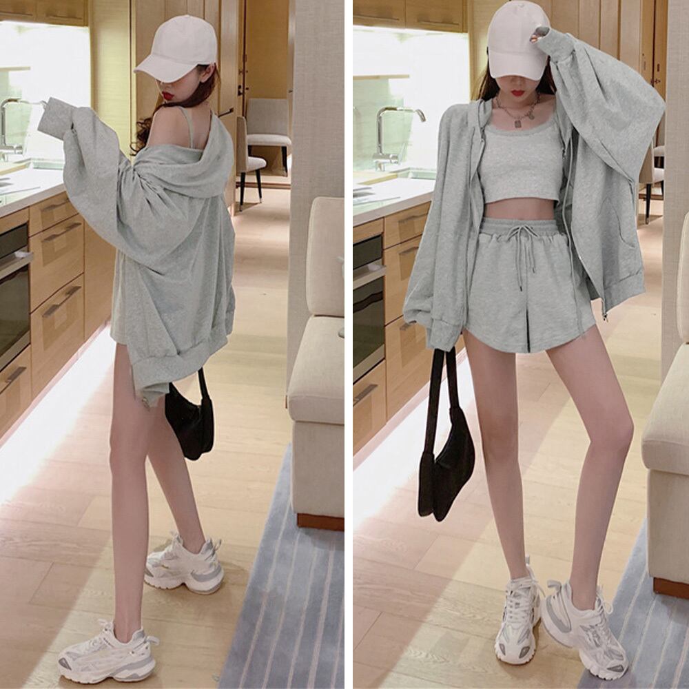 可愛い 部屋着セット 長袖 ルームウェア カジュアル ジップアップパーカー ショート丈キャミソール ショートパンツ 春夏