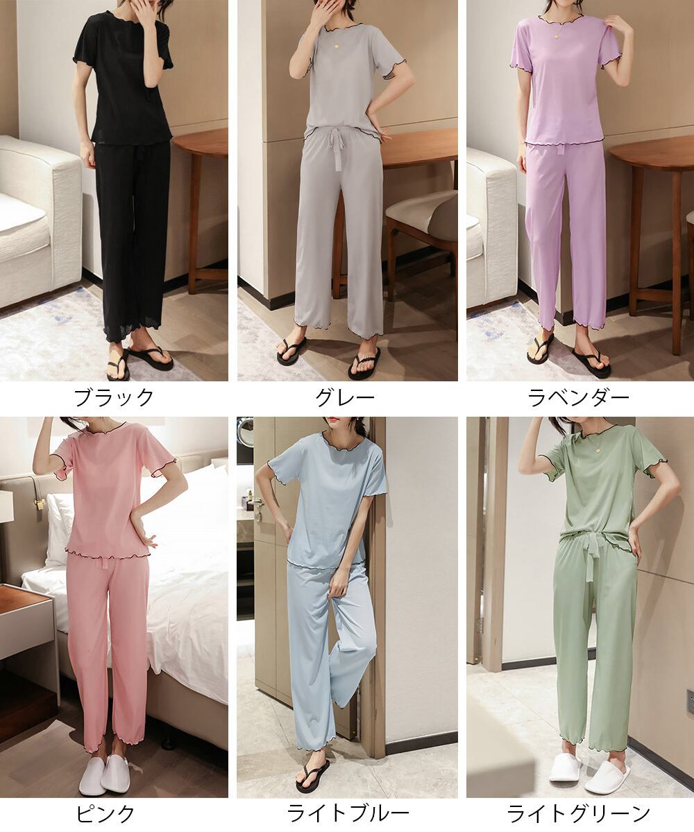 メロウフリル半袖トップス 薄手長ズボン 寝間着セット 大人可愛い 部屋着 無地涼し気 リボンナイトウェア 快適夏パジャマ