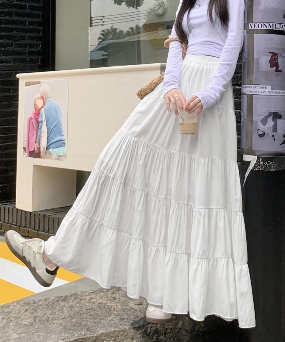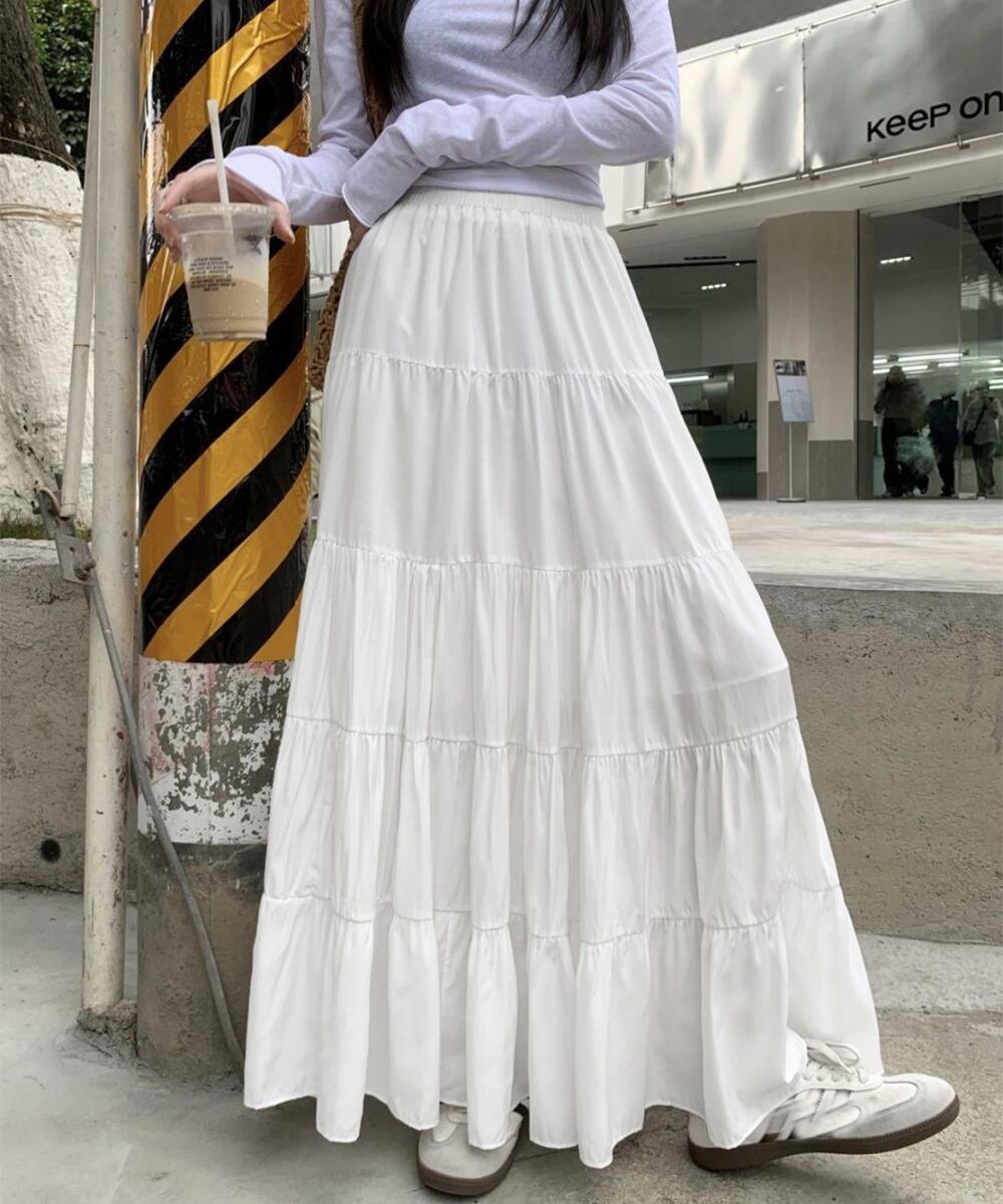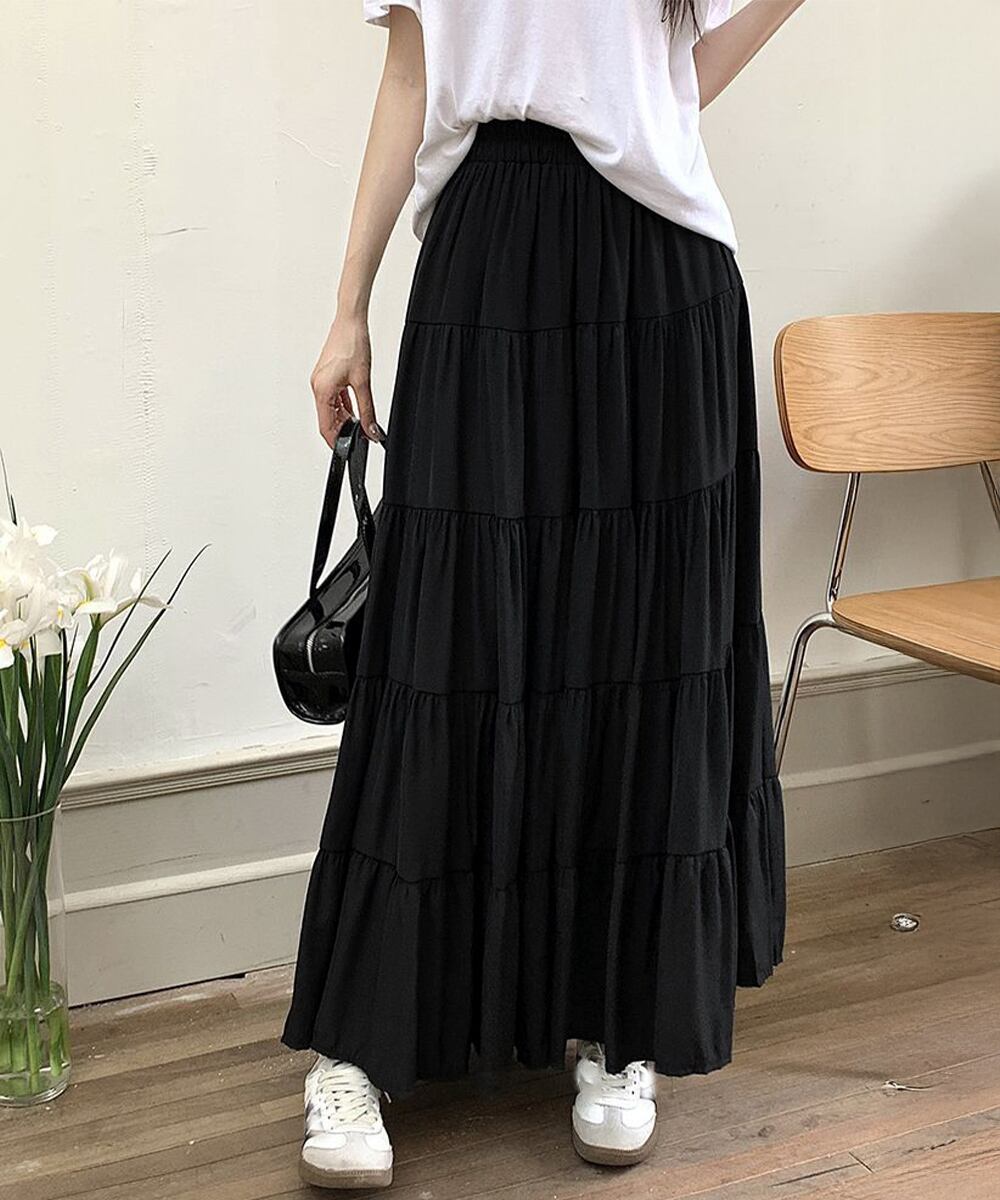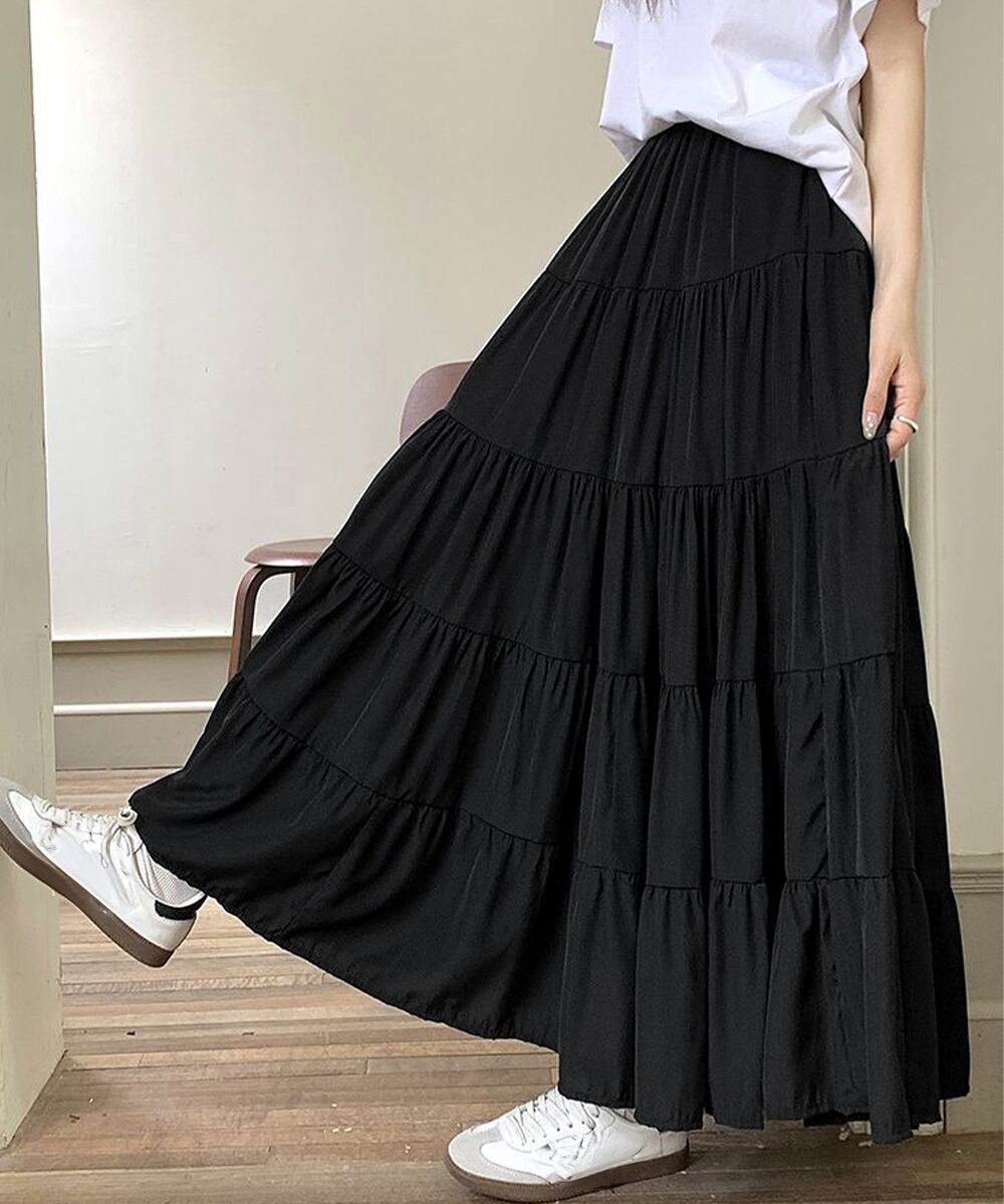 着心地抜群のソフトティアードロングスカート。