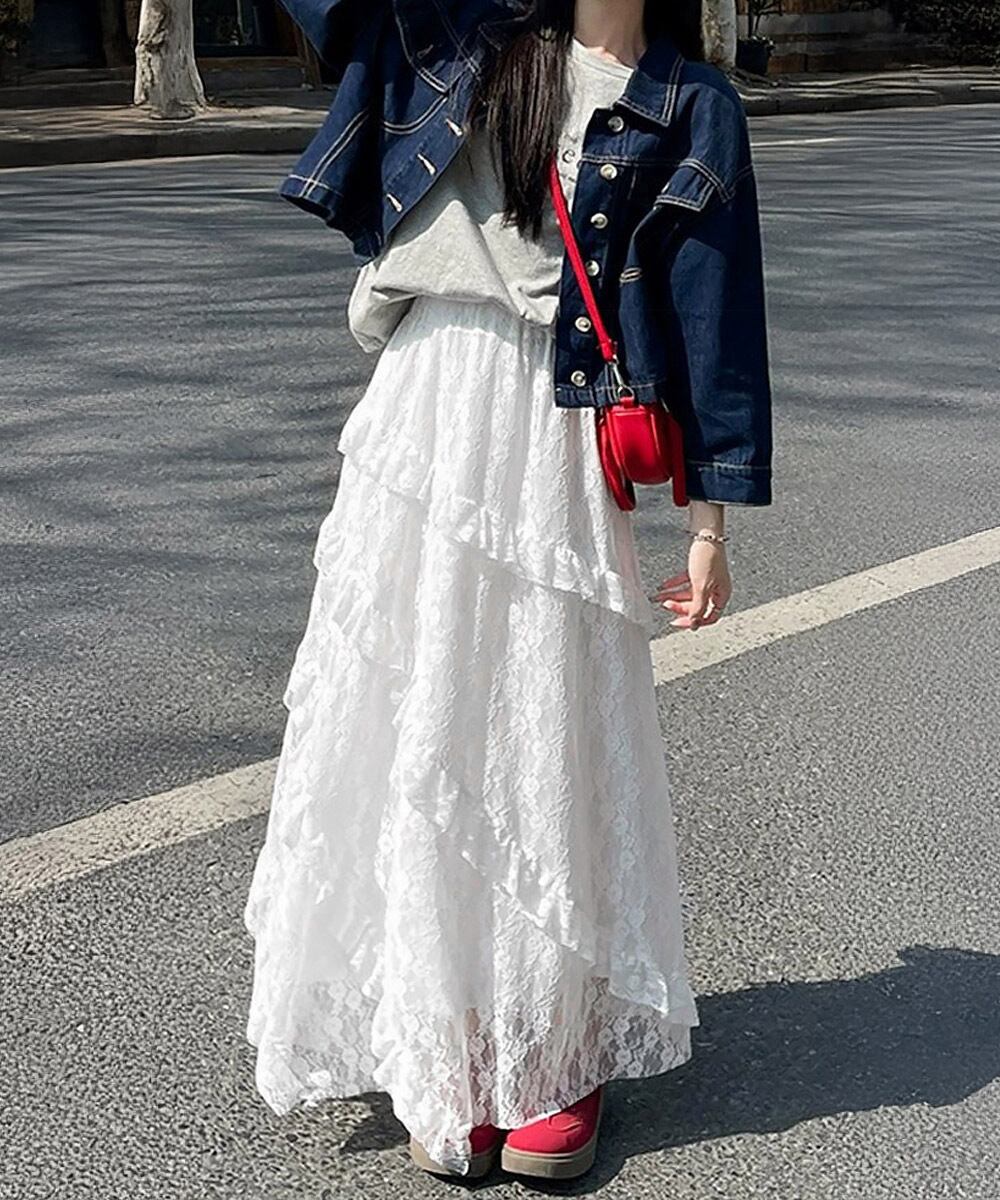 繊細なレース素材を使用した、フェミニンな印象の白いロングスカート。