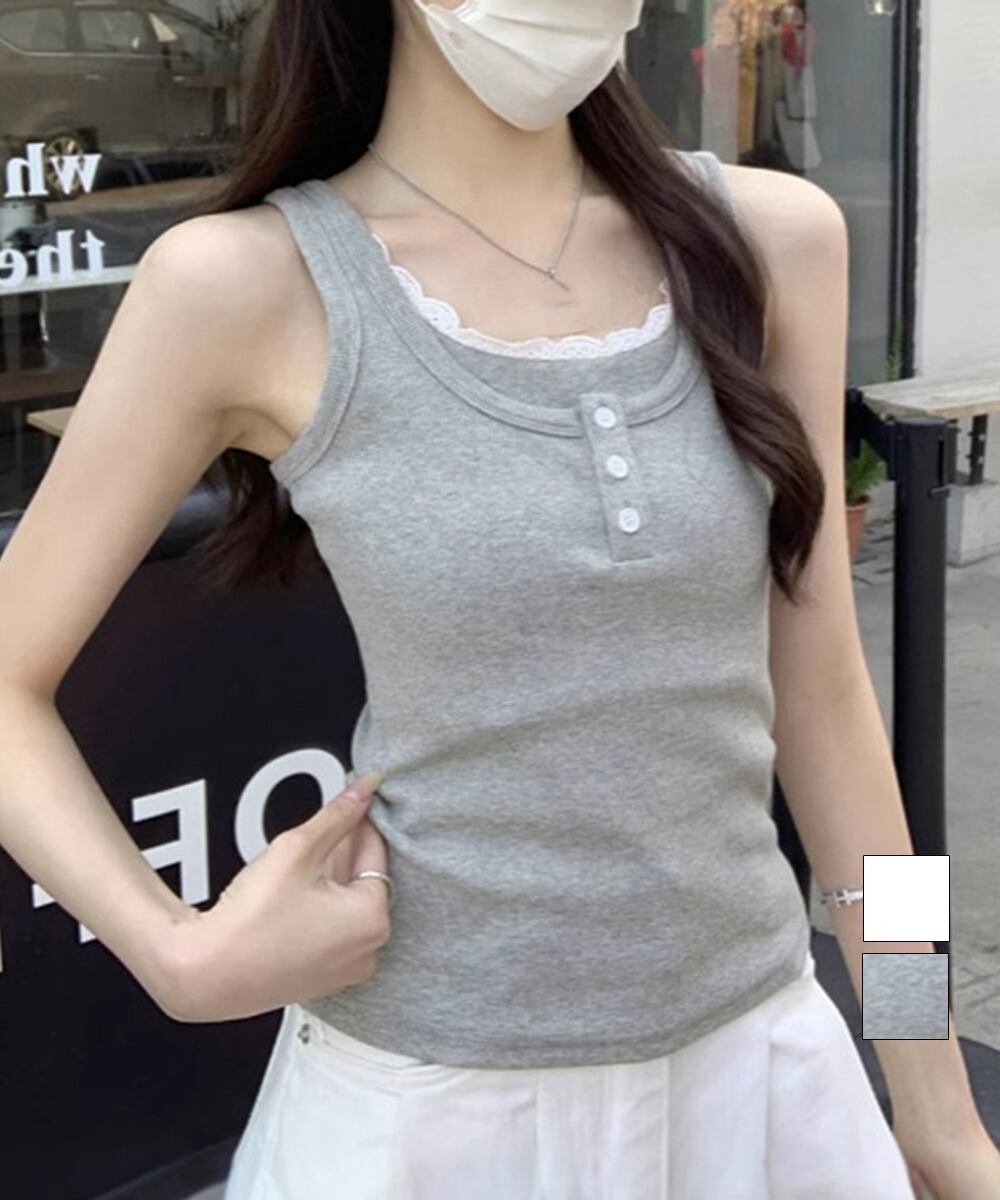 レース付き リブタンクトップ 大人カジュアル ノースリーブ夏服 カットソー 可愛い肌着 フィット 着回しインナートップス