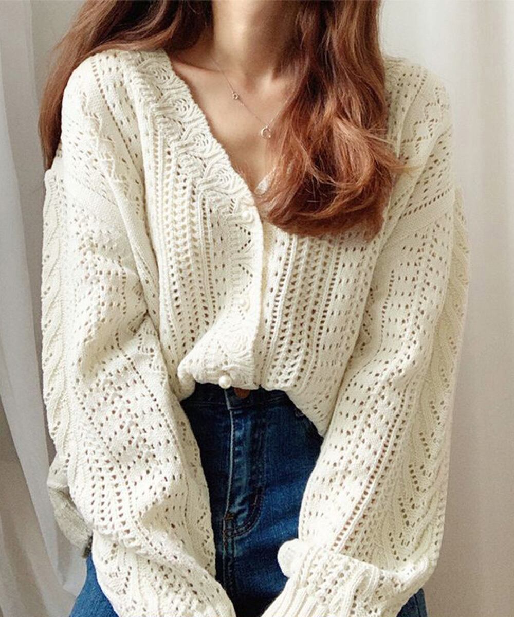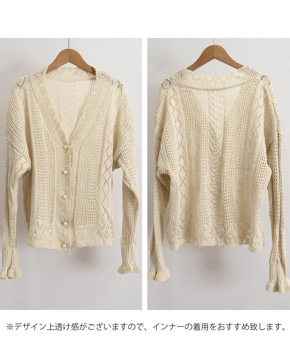 春夏はもちろん、秋にも活躍するゆったりシルエットの透かし編みニットカーディガン。