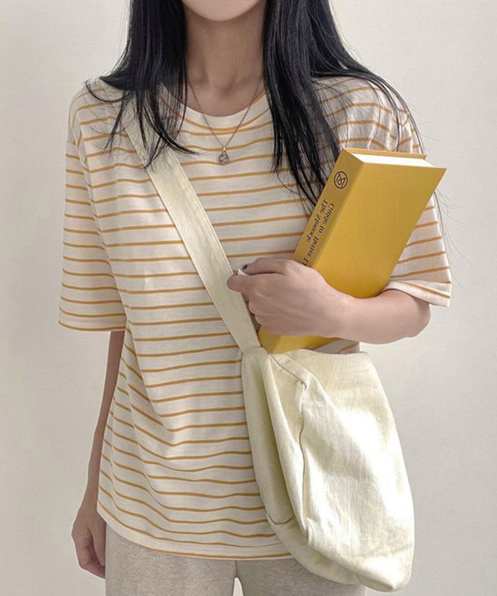 ラウンドネック 配色ボーダー半袖 ロングTシャツ ゆったり着やせプルオーバー 着回しカットソー 体型カバー ゆるt韓国風
