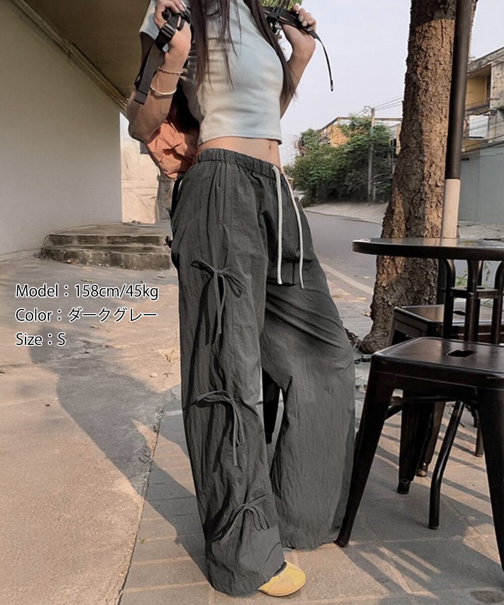 サイドリボンがアクセントになった、ラフなムード漂うカーゴ風ワイドパンツ。